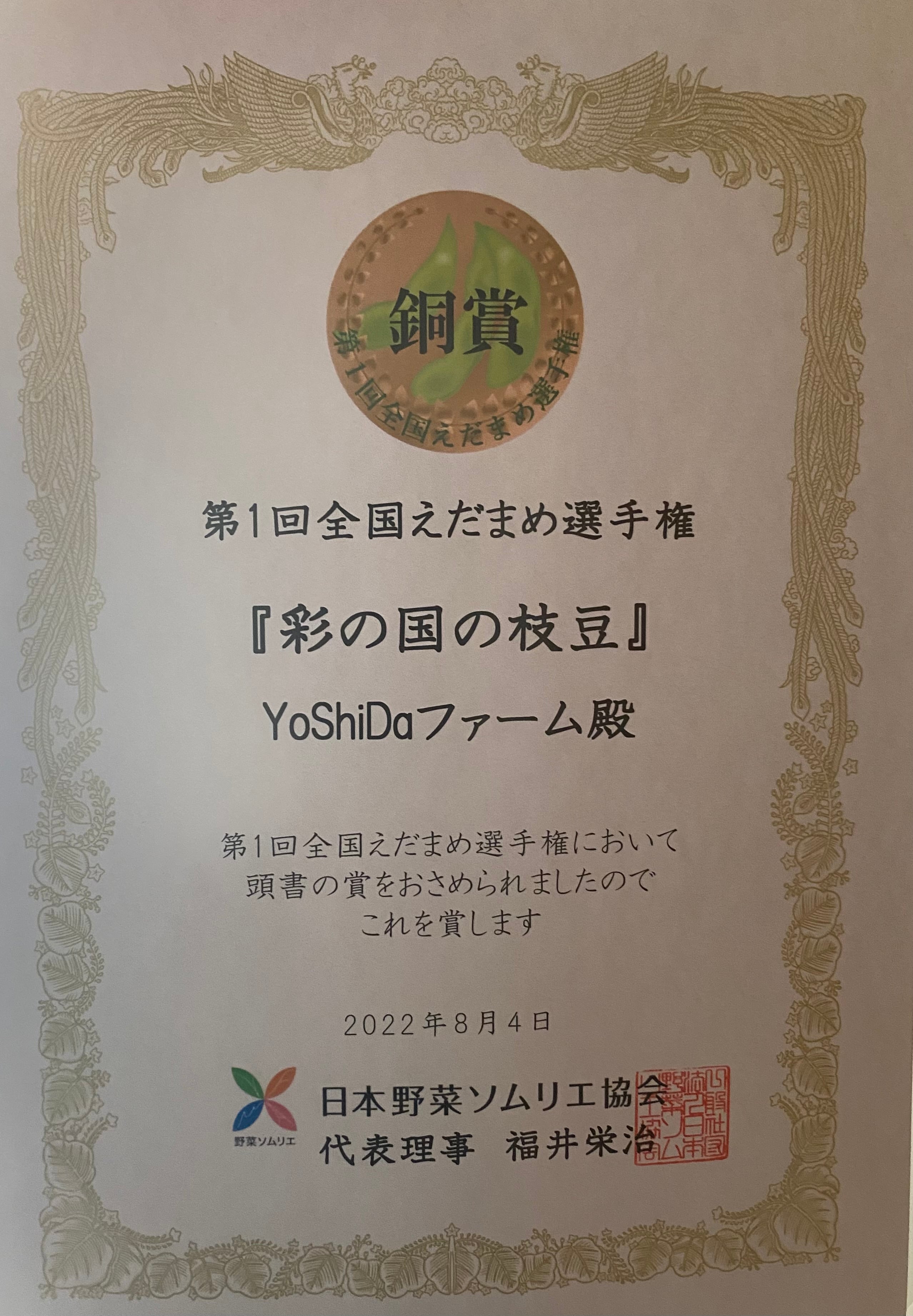 令和4年8月4日に全国えだまめ選手権があり、見事にYoShiDaファームの茶豆風味の枝豆が銅賞受賞いたしました!評価委員のコメントでは香りが強く、風味がよい!うまみ・香り・甘みのバランスがgood!