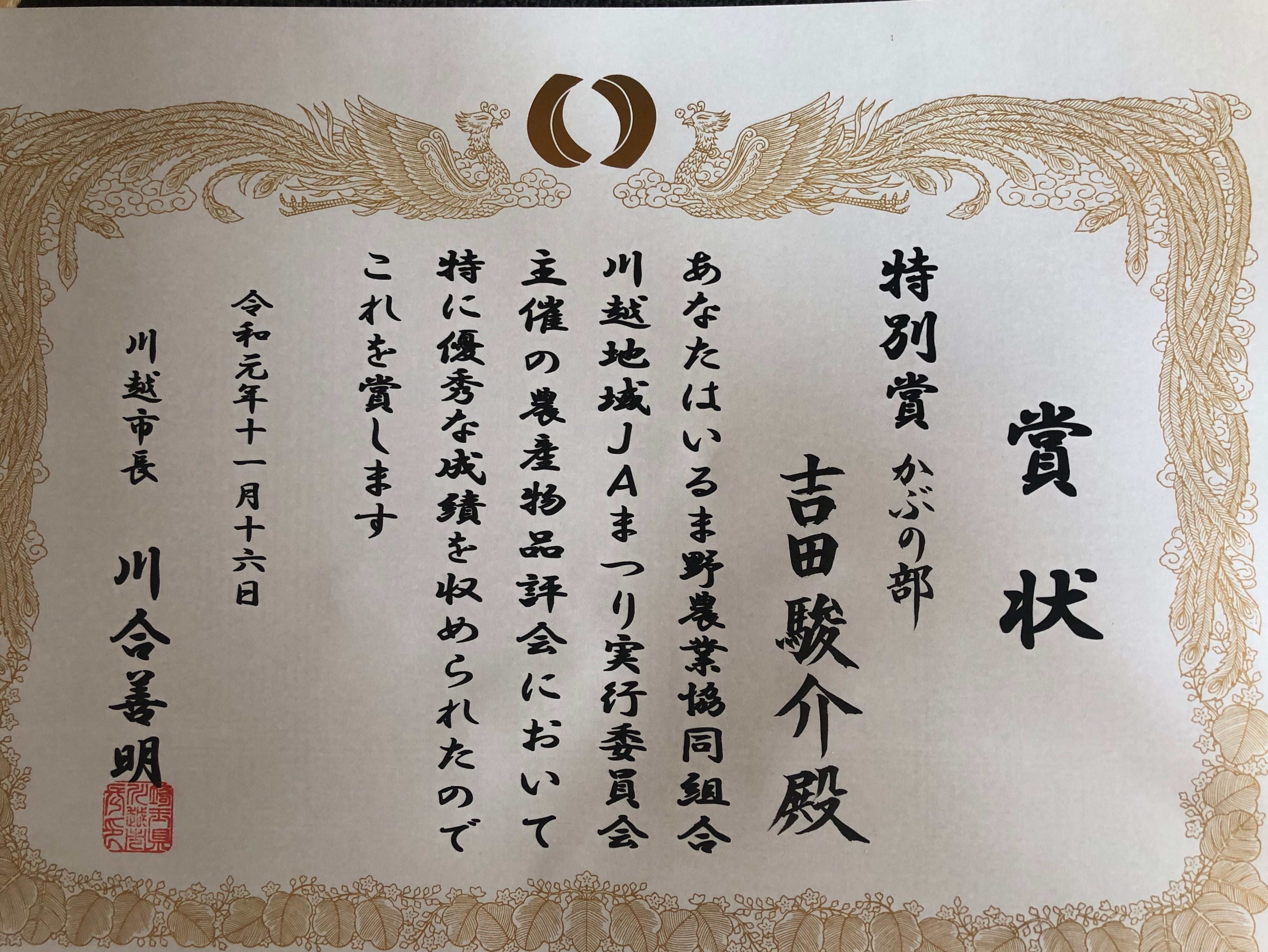 令和元年11月16日川越地域JA祭りでYoShiDaファームのカブが川越市長賞受賞いたしました!
